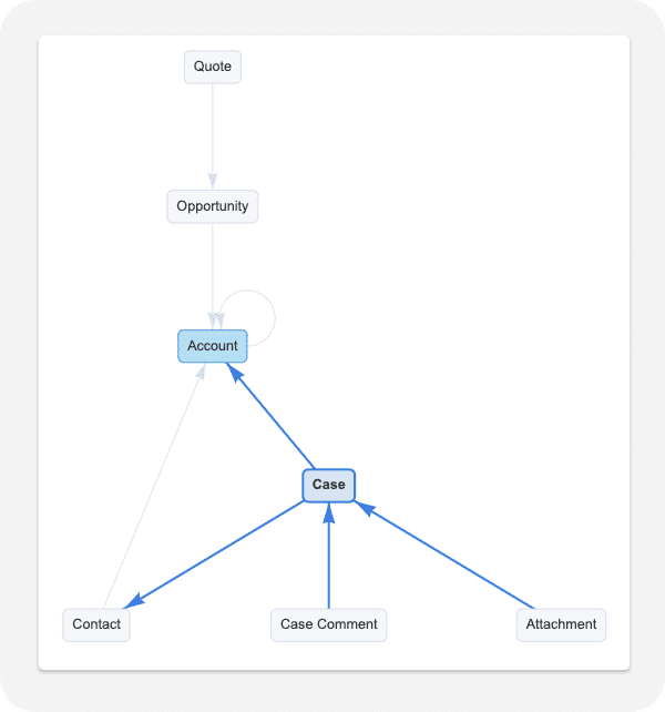We provide prebuilt templates of commonly used record types that let you move entire relational data schema at once. Easily move your entire Sales Cloud, Service Cloud, Industries Cloud, or any other subset of your Salesforce schema. For example, migrate Accounts with all related Contacts, Opportunities, Quotes, and Cases with Case Comments and Attachments with a single click.
