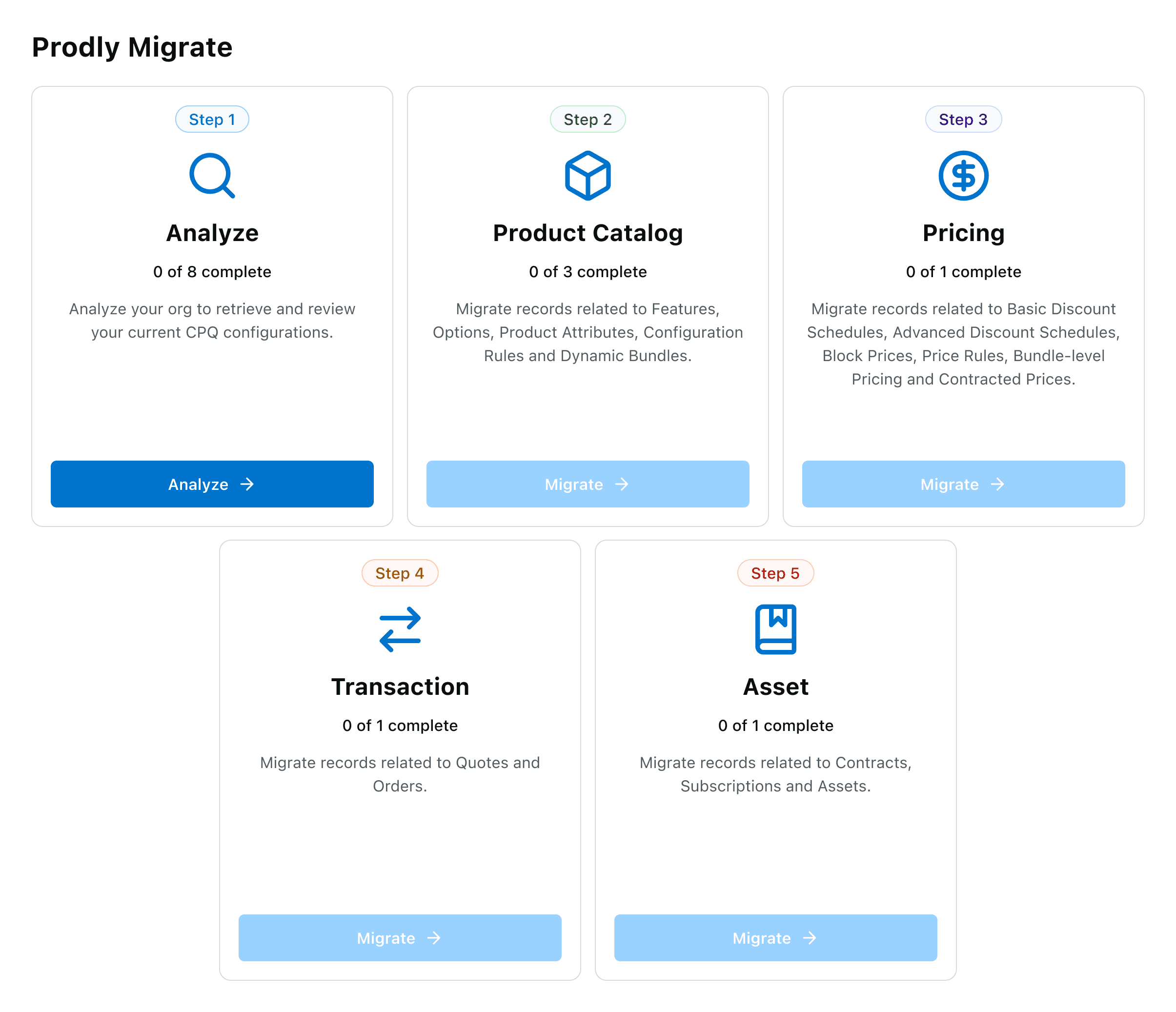 Prodly Migrate guides you step-by-step through analysing your CPQ setup, surfacing risks and gaps, and automatically mapping it into a ready-to-use Revenue Cloud Advanced configuration.